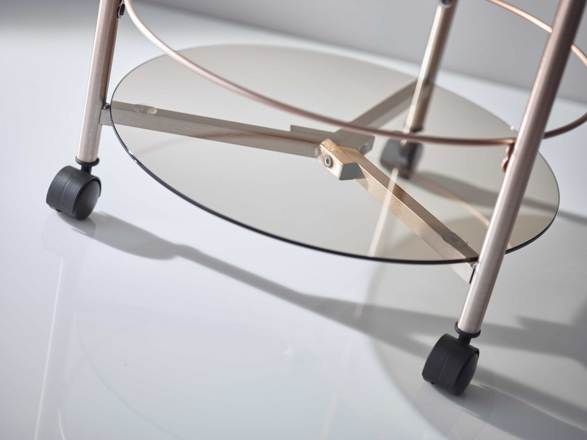 This Rolling End Table embodies the knack for combining function and high design. With 3 wheels in place, this is a versatile piece that can move to accommodate any situation. A brushed copper frame supports two tinted glass table tops, with a metal ring in place to ensure your favorite beverages are transported with care. This table has a total weight capacity of about 33 lbs.
