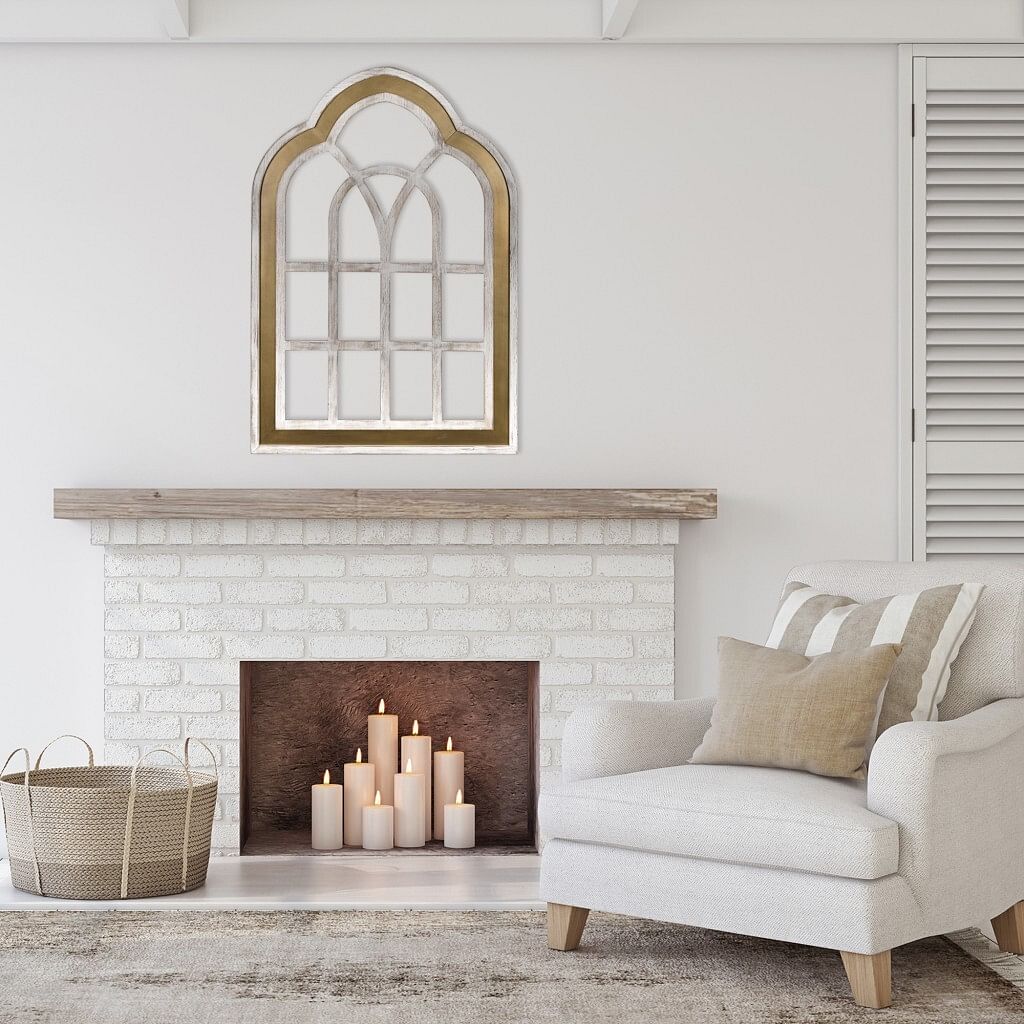 Selecting a piece of wall decor is an art in itself. By choosing the Distressed White and Gold Cathedral Window Wall Decor, you are certainly showing that you are a person with discerning tastes. This casual yet refined wall ornament exudes tradition that takes its cues from vintage and European style cathedral windows. This beautiful wall art is carefully constructed of bronze-gold tone finished wood that contrasts with the distressed white wash finish around it. Made of 80% MDF wood veneer and 20% MDF, this wall decor will make any wall within your home come alive. 42″ H x 28.60″ W x 1.20″ D.