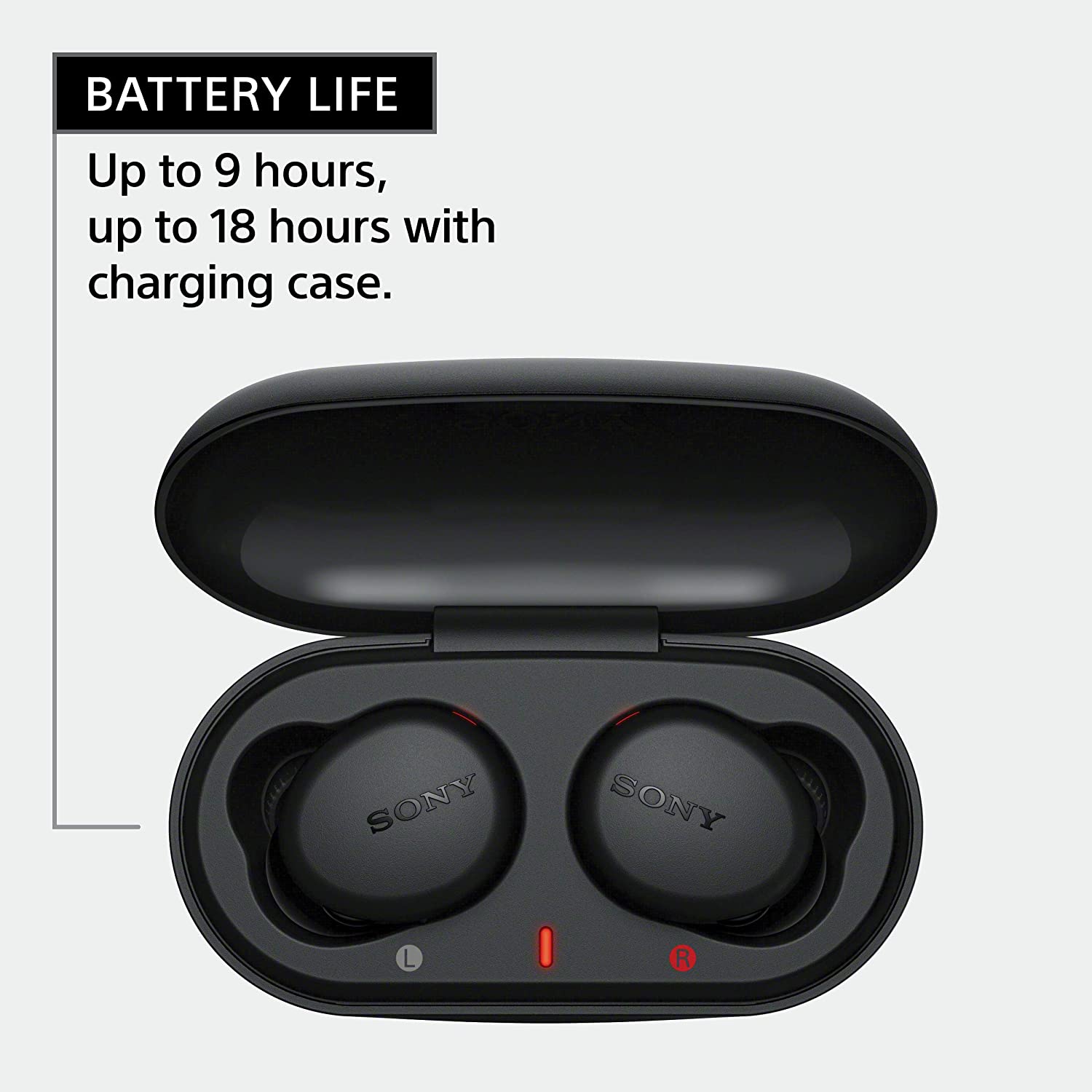 Up to 9 hours battery life, total 18 hours with charging case